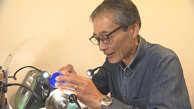 大阪府出身で工作が大好きだった啓二さん。大学の工学部を卒業後、神奈川県の通信会社に勤め、半導体の開発に没頭しました。30歳の時、英会話スクールの講師をしていた、徳島県出身の賀津子さんとお見合い結婚。4人の子供を育てます。そんなお2人に転機が訪れたのは、50歳を過ぎた頃。賀津子さんは以前から「子育てが落ち着いたら、田舎に暮らしたい」と思っていました。そんな賀津子さんの意見に啓二さんも賛同し、賀津子さんの地元・徳島県に1軒家を購入。専業主婦だった賀津子さんは一足先に移住しました。一方、神奈川県に残っていた啓二さんは、大学時代の知人がやっていたカットガラスに興味を持つように。59歳から「江戸切子」の教室に4年通い、モノづくりの才能が開花しました。「第2の人生は切子職人だ!」そう思った啓二さんは、2019年に徳島県に移住し、翌年『KJ工房』を開きました。