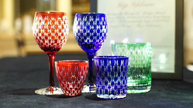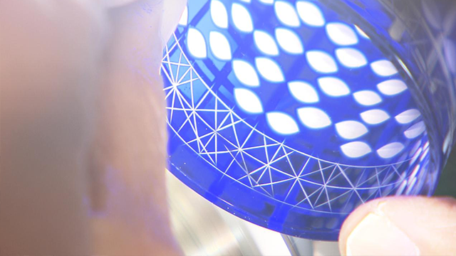 世界最大級のデザインコンペで入賞するほど腕を上げた啓二さん。この日は、切子細工で邪気を払う意味合いがある「菱菊つなぎ」という文様に、乾杯するときにグラスを合わせる様子を表現した文様を組み合わせた作品を作りました。「コロナ禍で疎遠になっていた仲間たちとの付き合いを復活させてほしい」そんな思いを込めて、作品には「再会」という名前を付けました。
