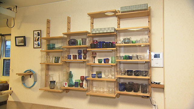 夕方、小豆島で家族ぐるみのお付き合いをしているダニエルさんご夫妻から依頼を受けた切子細工の花瓶が完成。小豆島の特産品のオリーブに、音楽が好きなダニエルさんご夫妻をイメージして音符をデザインしました。早速、お花を飾ってもらい、「すごく素敵!」「かわいい!」と、とっても喜んでもらえました。よかったですね、啓二さん。