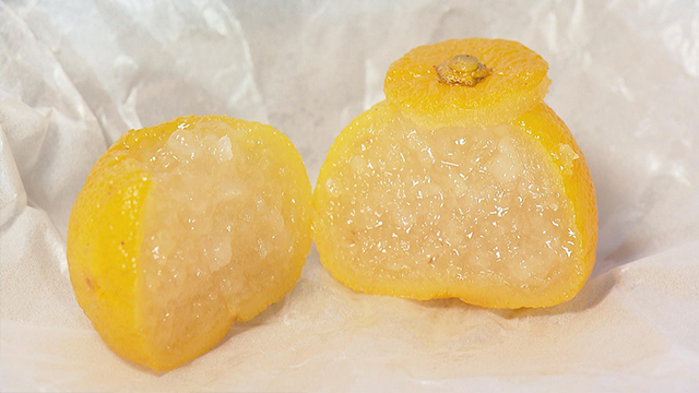 今回は冬がテーマ。まずは、ミカンの皮やジャムで味や風味をつけた「蜜柑の生菓子」から。また能登では冬に水ようかんを食べる風習があり、由紀さんは自家製の大納言小豆をふんだんに使い、甘さ控えめの水ようかんを作りました。続いてはシロップ漬けの柚子の皮に、柚子果汁で味を調えた道明寺粉を詰めた「生柚餅子」。これは軒先につるし、収穫体験をして頂きます。最後のお菓子はというと…突然、由紀さんが首からお菓子入りのお盆をつり下げノスタルジックな“駅の売り子”に扮して登場!お持ちしたのはようかんをカステラ生地で挟んだ昔懐かしい「シベリア」です。参加者の皆さんも「面白い!」と大喜び!お客さんを楽しませながら、里山の知恵や歴史も添えて伝える、これが「の菓子スタイル」です。