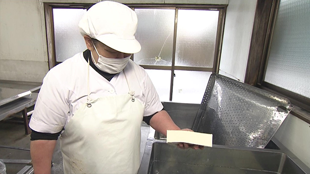 里香さんの豆腐作りになくてはならない人が夫の健治さんです。朝早くから工房で機械の熱湯消毒とにがりの調合を手伝い、そのあとで自身の勤めるガソリンスタンドに出かけます。そして、ここからは毎日が真剣勝負。にがりを投入し、専用の機械で圧力をかけ、固まり方を見極めます。1丁分に切って水槽から持ち上げた豆腐は、プルルルン!とても弾力がある「昔とうふ」が完成しました。