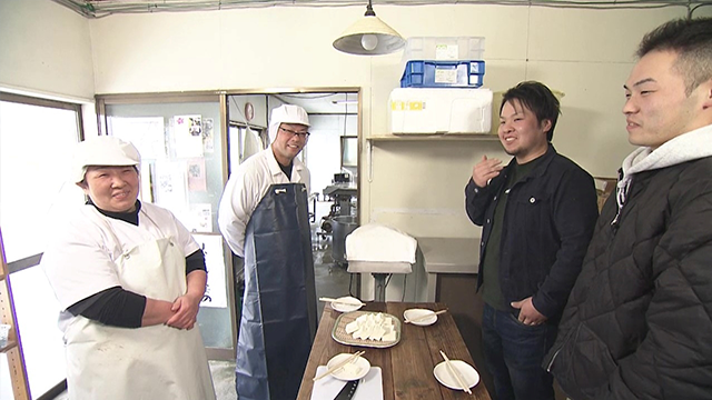 工房で作る「昔とうふ」を市内に配達です。向かったのは、生産者が主役!という産直『新鮮館おおまち』や、居酒屋『ぐでんぐでん』。居酒屋メニューの揚げ出し豆腐に固めの豆腐が重宝されています。また、里香さんがかつて勤めていた観光牧場が営むハム工房には、おからをソーセージに加工してもらっています。いろんな方にお世話になっていると、感謝しきりの里香さんです。