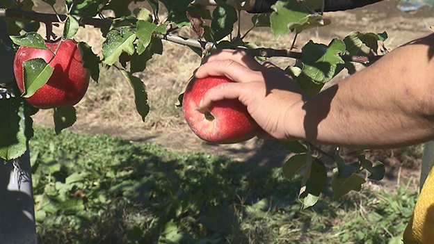 秋晴れのもとジョナゴールドの収穫です。愛さんはリンゴの収穫、初体験です。「できるかな?」と心配ぎみの愛さんに、「リンゴをそのまま引っ張らずに手首を返す感じ」と優しく教える浩さん。夫婦で初めての収穫、嬉しいですね。