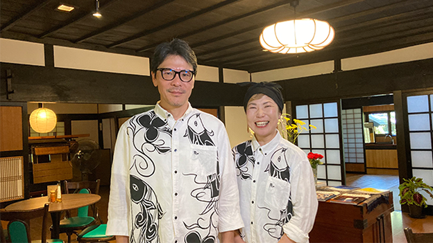 お向かいに住む宮下明芳さん、久子さんご夫婦は、鐘大さんと紀子さんの心強い味方。移住したばかりの頃、宮下さん夫婦は沖縄からやってきた鐘大さんと紀子さんを心配し、色々サポートしてくれました。大工である明芳さんは、『沖繩茶屋 仲谷』をオープンするにあたり、厨房の改装を手伝ってくれました。実は鐘大さんと紀子さんが住む前から長年、仲谷の家を管理してきた明芳さん。向かいに『沖繩茶屋』が出来たことを「俺は家が近くだからたくさん来られる」と大喜びです。さらに、妻の久子さんは毎日玄関先に自家製野菜を届けてくれます。この日もゴーヤやナスなどたくさんの夏野菜が玄関を守るシーサーの前に置かれていました。宮下さん夫婦を「中川村のお父さん・お母さん。隣にいるというだけですごく安心。」というお2人。古民家がつないでくれた宮下さんご夫婦とのご縁に感謝し、これからも大切にしていこうと誓う鐘大さんと紀子さんです。