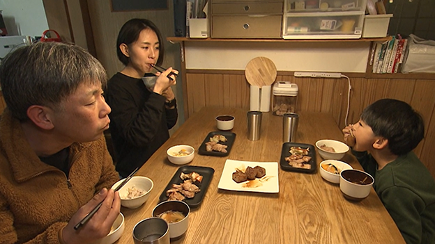 長男・空穏くんの誕生を機に、神石高原町に移住したご夫婦。手に入れたマイホームで、愛犬たちと賑やかに暮らしています。この日の晩ごはんは、町の特産品であるコンニャクの味噌田楽とキノコがたっぷり入った麦味噌仕立ての味噌汁。味噌蔵を継いで忙しくなったからこそ、晩ご飯は必ず家族一緒に食べています。ホッと温まる、家族でのひとときです。