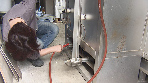 この日は、素焼きした物に釉薬をかけ窯詰め作業です。釉薬が乾いたら、ガス窯に詰めます。詰める場所によって焼き上がりが違うので、試行錯誤を繰り返し詰めていきます。およそ1時間かけて60個の作品を詰め終えました。翌日、窯に火を入れ、窯の内部が何と!1250度になるまで約18時間もかけて焼いていきます。