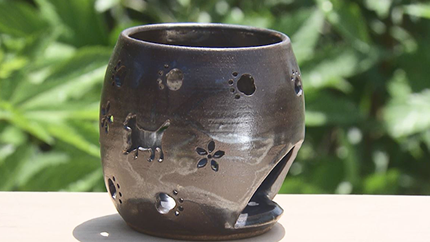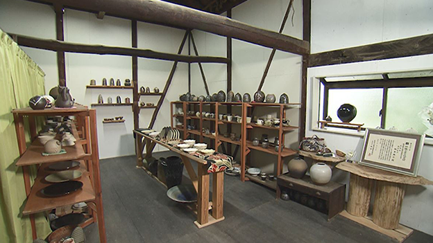 笠間焼は江戸時代中期、笠間の名主が信楽焼の陶工から指導を受けて窯を開いたのが始まりと伝わり、食器や花器など普段使い出来る「暮らしの焼き物」として親しまれています。典子さんの作品も日常的に使えるものが大半で、中にはネコをモチーフにした茶香炉や茶碗もあり、特に女性から人気です。自宅は築60年の古民家でパートナー藤田博美さんとの暮らしを満喫しています。休日、藤田さんは畑で野菜を作り、動物好きで烏骨鶏9羽、ウズラ8羽と犬1匹、ネコ2匹を飼っています。