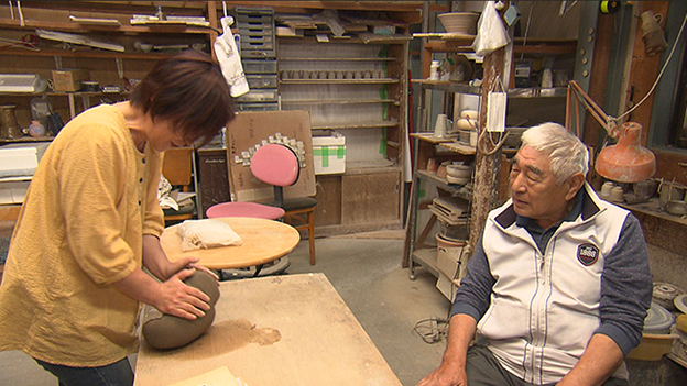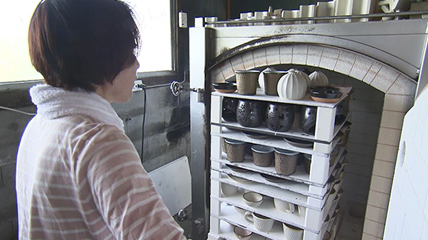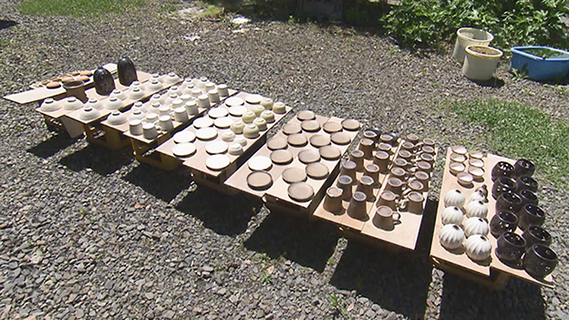 典子さんの師匠は諏訪幸雄さん。諏訪さんは、かつて茨城県窯業指導所の所長を務め、笠間焼の後継者育成に力を注いできました。典子さんは諏訪さんの元で最初は小皿作りから修業しました。諏訪さん曰く「小皿を同じ大きさ、同じ厚さで何枚も作り、ろくろに慣れろ、それが基本」。諏訪さんには今でも色々な相談に乗ってもらっています。