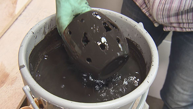 窯の火を止め2日間冷ましてから窯出しです。窯の中には、従来とは違う仕上りを狙った茶香炉があります。これまではツヤが無い“炭化焼成”でしたが、今回はツヤありの“酸化焼成”。注目の結果は、大成功です!典子さんが狙った美しい焼き上がりになりました。