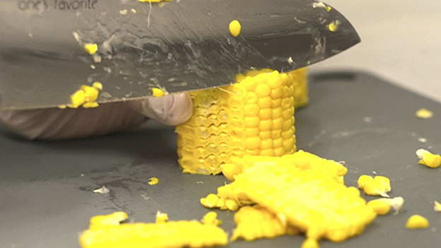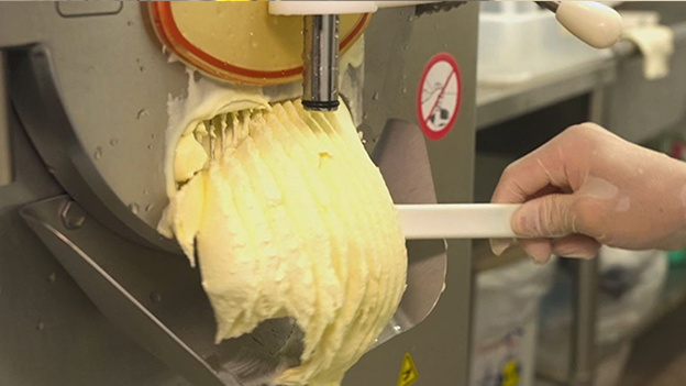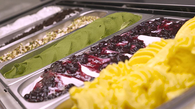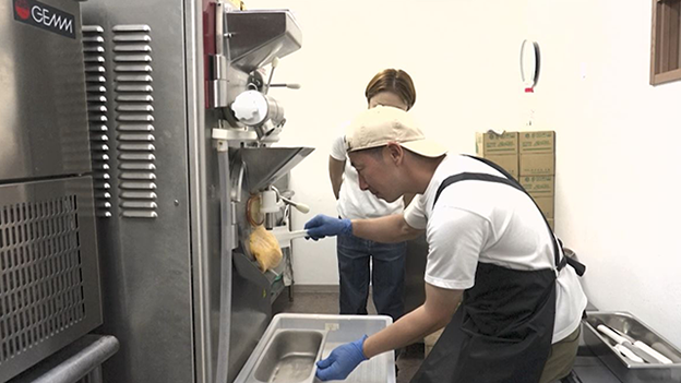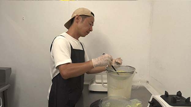 仕込みは毎朝5時から。店の厨房には、昨日収穫した地元産トウモロコシの甘~い香りが。コーンのジェラートを作ります。糖分や水分量に気を付け、滑らかな食感を目指し、丁寧に裏ごしします。みんなに笑顔になってもらいたい、そんな思いでジェラートを届けています。