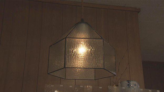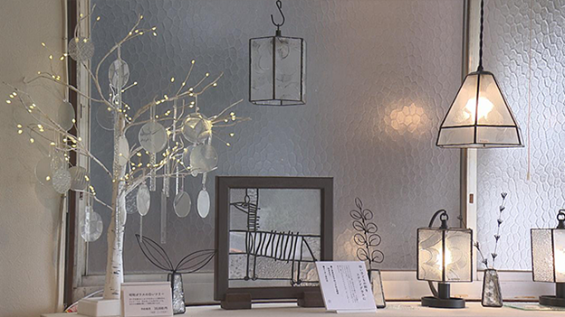 『びいだま舎』の店舗には、型板ガラスを加工したオーナメントやアクセサリーなど、オシャレな作品が並びます。昭和の時代に盛んに作られた型板ガラス。板ガラスの片面に様々な模様を付けることで、光は取り入れつつもガラス越しの風景をぼかし、プライバシーを守ることが出来るものです。「銀河」や「きく」、「クローバー」など、実に様々なモチーフが作られました。よく玄関の扉などに使用されていた「つづれ」と名付けられたガラスを使ってペンダントシェードを作ると、その出来栄えに驚いた容子さん。窓にはまったガラスの状態ではその魅力に気づきにくいですが、照明にして明かりを入れると、キラキラと模様が浮き上がり新たな表情を見せてくれたんです。「こんなに綺麗!ほら!」と絶賛する容子さん。「今、型板ガラスに夢中です」と、目をキラキラ輝かせていました。