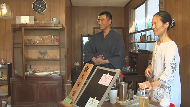 店内には型板ガラスを生かしたオーナメントやアクセサリーなどお洒落な雑貨が並びます。割れたガラスを様々な形に加工したカケラを利用し、複数を糸で吊るす「ゆらゆらオーナメント」は店内で手軽に作ることができ、風に揺られシャラシャラと奏でる音はとても涼しげ。予約制のワークショップでは、好きな柄のガラスを選んでステンドグラスの技法でハンダ付けし、容子さんの指導の元パッチワーク状の飾りなどを制作できます。「世界でただ1つの作品ができた!」と、お客様から大好評。そんな『びいだま舎』に、毎日のように野菜を差し入れてくれるのが髙野勝利さん。この建物の持ち主で、かつてここで電子部品の工場を営んでいました。実は髙野さん、若い頃に型板ガラスの模様の型を彫る仕事をしており、まさに運命的な出会いです。日々創作活動に打ち込む容子さん、疲れて家に帰れば会社員の夫・斉さんが手料理を準備してくれています。そんな夫の支えも容子さんの大きな力となっています。