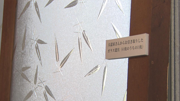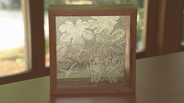 店のスタッフと、容子さんの活動を支える心強い応援団のおかげで『びいだま舎』の活動の幅が広がってきました。創建から700年以上の歴史がある雲樹寺へ出向いた容子さん。以前に住職から、お寺で使われていた型板ガラスで記念になる物を作ってほしいという依頼がありました。それを受けて容子さんが製作したのが「雲樹寺の窓」。木製の枠の奥に型板ガラスをはめ込み、手前のガラスにはサンドブラストで天女像を描きました。この天女像は寺に伝わる歴史ある鐘に描かれているものです。ボックス状になっており、大切なものを飾れる仕組みで、台所のガラス戸だった型板ガラスが素敵な作品に生まれ変わりました。続いて訪れたのは写真がテーマの宿『YASUYA』。以前の依頼でお風呂にはまっていた型板ガラスを使いランプシェードを製作したのですが、今回はその際に残ったガラスで小皿を作りプレゼントしました。オーナーである鈴木さんは「この建物にあったガラスを生かしてもらえるのがすごく嬉しい」と喜んでもらえました。