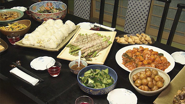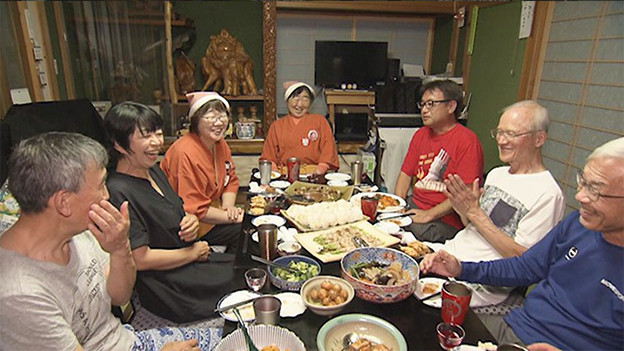 『古今呂の宿 福とみ』にお客様がやってきました。避難当時に知り合ったボランティアグループの皆さんで、すでに何度か泊まりに来てくれています。この日は「いいたて雪っ娘」の収穫日。宿のお客様にも体験してもらい、カボチャ作りの楽しさを分かち合います。夕食では「雪っ娘」入りのエビチリや飯舘村の郷土料理「凍み餅」など、とみ子さんの手作り料理が10品以上並びました!来てくれた方に「実家に帰ってきたような気持ちになってほしい」という思いから「福とみ」では宿のスタッフも一緒に食卓を囲みます。飯舘村のあったかい家族。ここはもう、みんなの故郷ですね。