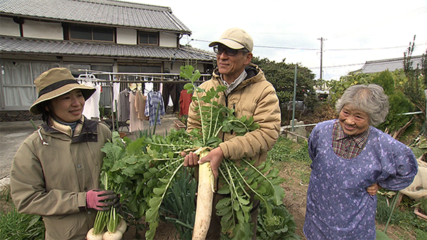 ご自宅の隣に住んでいるのが野菜作りの師匠、進藤チヨコさん90歳です。「畑からなんでも持ってって」と言ってくださり、今日はカブとダイコンをいただきます。チヨコさんは「若い人がきてよかった」とお2人の移住を喜んでくれています。島の大先輩に元気をもらって楽しい移住生活を送っています。