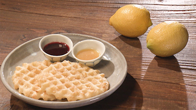 ご夫婦が始めたカフェ。落ち着いた雰囲気の室内、外のソファ席も人気です。この季節はレモン果汁たっぷりの「ホットレモネード」がおすすめ。志乃さん手作りの「レモンカード」は、レモン果汁にバターや卵、砂糖を加えてペースト状にしたもので、ワッフルに付けていただけます。「まろやかな酸味」とお客様にも好評です。