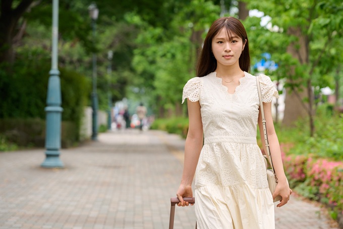 一方で、白いワンピースがよく似合う、社長令嬢らしい知的で物静かな《おしとやかさ》の中に、こうと決めたことは諦めない《凜》とした強き女性の雰囲気をもまとう渋谷演じる花。初夏の、緑豊かな都会の真ん中で、彼女の見つめる先にはいったい何が――?
