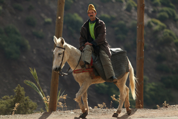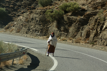 山間に続く道。この辺りからは先住民ベルベル人が暮らす土地です。往来が激しくなってきました。市が開かれているようです。周りの村々から来る人々は、買い物はもちろん情報交換もお目当て。週一回開かれるこの市を心待ちに日々を過ごすのだといいます。