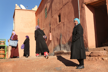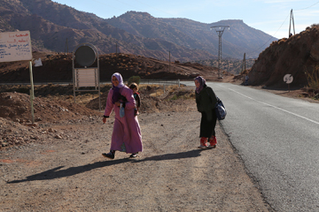 モロッコ中部。砂漠と山が織りなす風景の中を進みます。ここは人々が生まれ、暮らしを営む大地。行く手の丘にかつて砦だったカスバが見えました。カスバには城塞、住まい等、様々な形があります。カスバと街道。それはこの地に生まれた少女の原風景です。
