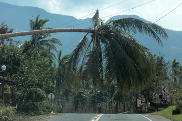 街道を進むと、台風の生々しい爪痕が次々と迫ってきました。後片付けをする人々や、被害にあった人々を乗せた車・・・。街道は人々の生命線です。一刻も早く通れるようにしなくてはと、救援隊も出動しています。懸命に汗を流す人々の姿に胸が熱くなります。