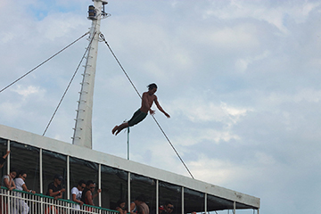 フェリーの目処がたち、港は活気を取り戻し始めます。出港を待つ船の屋根に何やら人影がありました。地元の若者たちの、ダイビングのパフォーマンスです。見ていると元気が湧いて来きます。桟橋を離れる船に目を細め、「もう大丈夫だ」と町の人が頷きました。