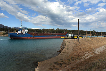 畔に標識がありました。古代人たちが石畳の上を丸太をコロにして船を引き、進んだ道です。それ程までの苦労をしても、海の迂回より半島横断の方がはるかに効率的だったという証です。