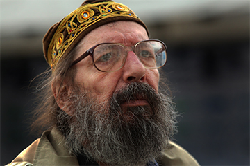 広場でペーテル・ヴォルコンスキーさんに出会いました。名門貴族の家系に生まれながらも、1980年代にパンク・ロック・ミュージシャンとして活動し若者たちの独立運動を牽引した、レジェンドとも称される人物です。