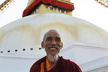 町を見守るかのような視線がありました。ボダナートは、ネパール最大のストゥーパで知られるチベット仏教の聖地です。密教の宇宙観を示す曼荼羅を模したストゥーパの周りを、巡礼者たちが経を唱え回ります。カトマンドゥとラサの交易が盛んだった時代から、人々は、ヒマラヤ山脈を越える旅路の安全を願い、祈りを捧げて来たといいます。ストゥーパの周りには沢山の宿坊や僧院が並びます。仏陀の教えを胸に五体投地を捧げる人々の姿がありました。この地は1959年のチベット動乱以降、ネパールに亡命したチベット人にとって心の拠り所だといいます。護摩を焚く僧侶たちが、「ネパールと日本の交流が始まったのは、河口慧海という高僧が、1899年にこの地を訪れた事からだ」と語ります。ボダナート。曼荼羅の宇宙がヒマラヤの峰々に広がっていました。