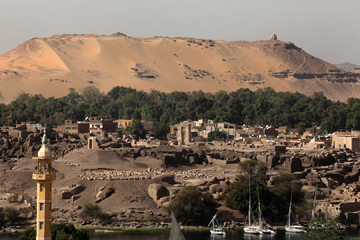 橋を渡ると古代人がナイルの水源と考えたアスワンに着きました。中洲に、川を司る神、クヌムを祀った神殿が見えます。