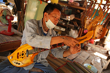 これは頭部に飾られる竜の彫刻です。メコン川の守り神だといいます。一家が作り上げる伝統楽器ピン。最近はエレキギターの様にアンプを使って演奏され、外国のポピュラー・ミュージックでも使われているそうです。