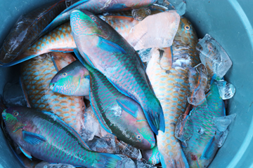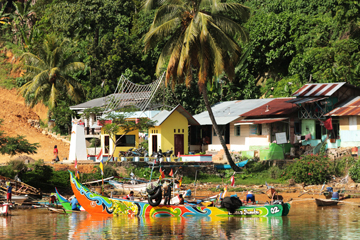緑に包まれた入江に、赤道近くの日差しを浴びてカラフルな舟が入って来ました。水揚げされた熱帯ならではの魚たちもカラフルです。仕分ける女性が、今日も大漁だと顔を綻ばせます。
