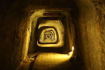 深さおよそ40メートルの地下へと向かいます。ガイドが、長さ1400メートルあまりのこの地下壕は、弾薬庫を始め指令室や兵舎、食堂などを備えた堅牢な要塞でもあった、と語りました。