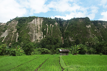 ブキティンギを後に、スマトラ島中西部の田園地帯を進みます。谷間の田んぼで、稲の手入れをする婦人に出会いました。「島の季節は雨季と乾季の二つ。今は雨季で、雨が降り出す前に一仕事終えなくては。」と、空を見つめます。柔らかな日差しが、辺りに降り注いでいました。赤道近くとはいえ、太陽は南に離れており、雲間に隠れる事もしばしばです。