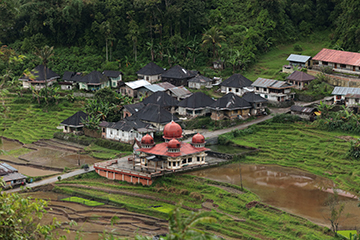 山間部に入ると雨が降り始めました。滴るような緑に囲まれ小さな村が見えます。モスクと家並み、そして棚田。なんとも長閑な眺めです。