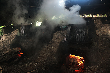 熱気が立ち込める中、甘い香りが漂います。黒糖が出来上がると、婦人が火照った頬を湖からの風に当てていました。そこには雲と雨と日差しが織りなす光景が広がります。