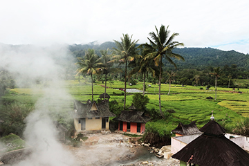 にこやかな笑顔あふれるスマトラ島の街道を、火山地帯に向けて進みます。シバンゴル・ジュルという山間の村にやって来ました。地表から湯気が沸き立ち、硫黄の匂いが辺り一面に漂います。ジュルとは源泉を意味する言葉で、温泉地として知られる土地だと村人が教えてくれました。