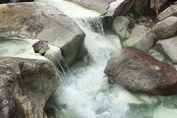 暖かいお湯が流れる川がありました。踏み分け道を登り源泉へと向かいます。村人しか知らないまさに秘湯です。その先に地中から熱湯が湧き出す源泉がありました。温度は45度以上と少し熱いが、流れてゆくうちに良い湯加減になるといいます。