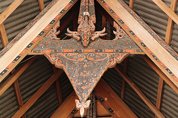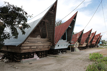 湖畔から道路で繋がるサモシール島へ向かいます。島には先住民族バタック人の文化が残っているといいます。道を進めば、反り返った独特の屋根を持つ高床式の家が目につきました。バタック人の青年が我が伝統の様式だと語り、民族村に案内してくれました。