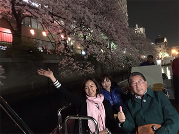大岡川堤の桜並木をオープンデッキの船上から見上げながら
