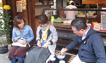 柴又帝釈天では、参拝客で賑わう参道に立ち並ぶお店をぶらぶら散策…。老舗の和菓子屋さんのお団子に大興奮!