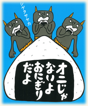 今回の主人公はおにぎりが大好きなオニのお話。人間を喜ばせたい一心でおにぎりをたくさん持って山を駆け下りてきたオニたち。