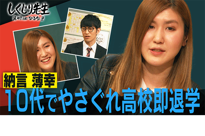「やさぐれ」ネタでブレイクした納言の薄幸が登壇しました。学生時代に大人に反抗して目立つのがカッコイイと思っていた幸先生は、わざと校則を破ったり、教師に暴言を吐いたりして何かと反抗するヤンチャな生徒だったという。その結果、入学から5ヵ月で退学処分になってしまい焦燥感に苛まれる日々を過ごすことに。そんな幸先生が、過去のヤンチャ行動を振り返りながら大人に反抗する生徒の特徴を独自解説。今、大人に反抗している人たちへ熱いメッセージと教訓をもらいました。