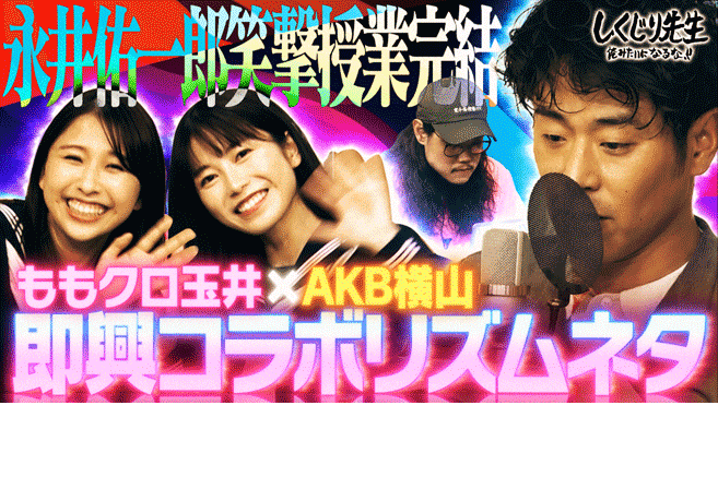 「アクセルポッパー」こと永井佑一郎先生のリズムネタ実習の授業でした。リズムプランナーの肩書を持つ永井先生が生徒からリクエストを聞き即興でリズムネタを作成。吉村の破天荒リズムネタを作成して吉村と若林がネタを披露。さらにももクロ玉井とAKB48横山の即興コラボも誕生!結果、独自のリズムと天然キャラで場を盛り上げる永井佑一郎先生は唯一無二だとういうことがわかりました。