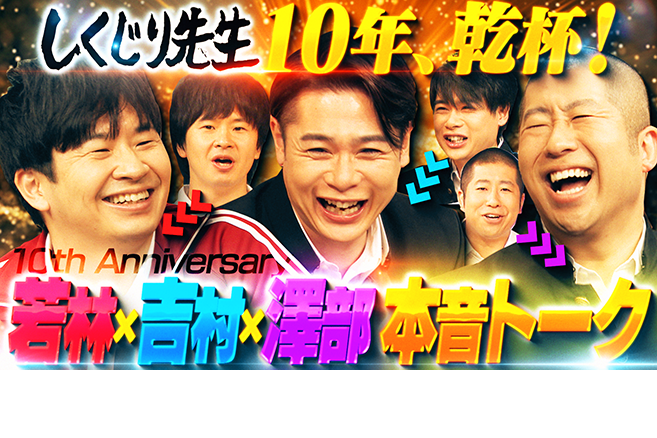 放送10周年記念特別企画「しくじり先生お疲れ様会」でした。2013年にスタートし、今年10周年を迎えたしくじり先生。若林・吉村・澤部の3人がしくじり先生と歩んできた10年を振り返りながら腹を割っての本音トークを展開。それぞれが思っていることを伝えながら年齢と意識が変化した10年を振り返りました。そして、これからも盛り上げていこうと新たなるチャレンジを決意した3人でした。