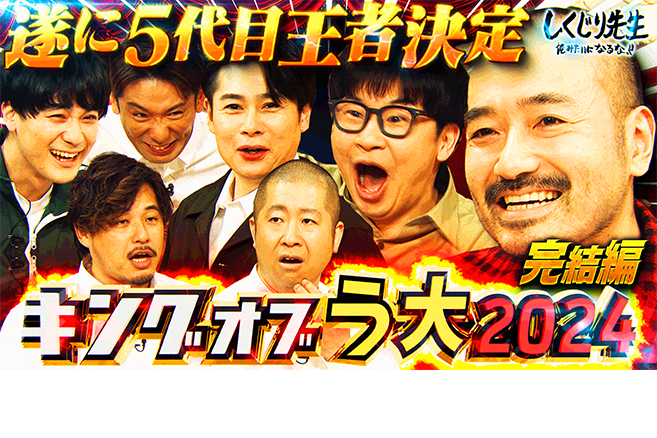 う大先生に評価されたい芸人たちのネタバトル「キングオブう大2024」完結編でした。金の国が歴代最高得点94点を叩き出し暫定1位の中、次に登場したダウ90000は91点と1位には届かなかったが、う大先生から刺さりすぎるアドバイスをもらう。5組目のしずるは自分たちの面白さを貫き93点と高評価をもらうもトップには届かなかった。そして、最後に登場したしくじり学園お笑い研究部チームは、ダウ90000蓮見が書き下ろしたネタで挑み初の90点台92点を叩き出し最下位を脱出する。結果、キングオブう大2024の栄冠は金の国が掴み取った。