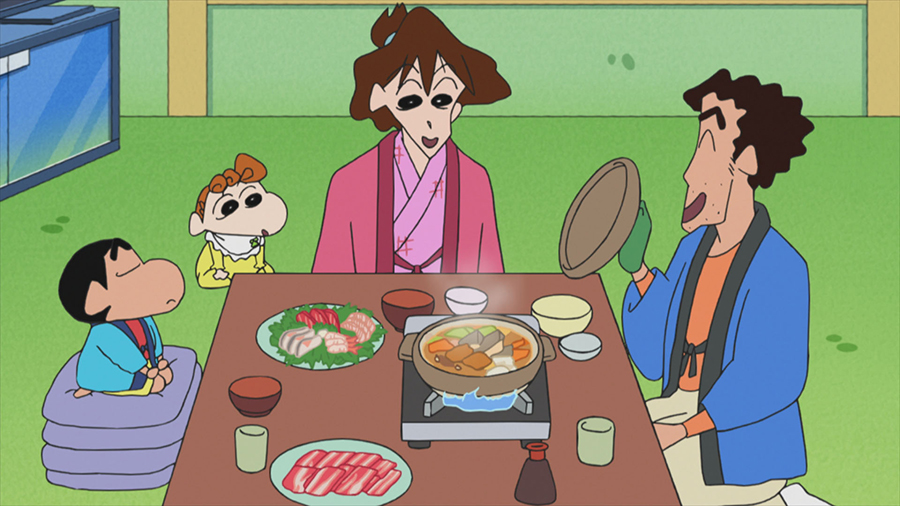 温泉に行きたいみさえのために、野原家を温泉旅館にするひろしとしんのすけ。