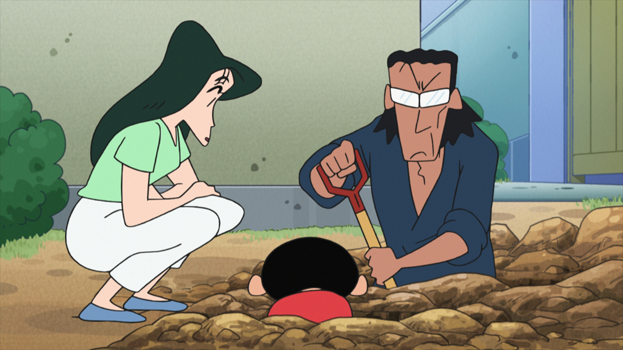 10年前、ななこと一緒に庭に埋めたタイムカプセルを掘り返そうとするななこの父・四十郎としんのすけ。