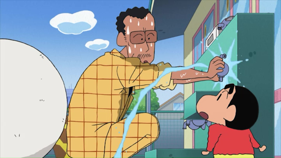 水飲み場の蛇口を交換している園長先生。元栓は閉めたはずなのに、突然すごい勢いで水が噴き出してきた。しんのすけに助けを呼んで来るように頼むが……!?