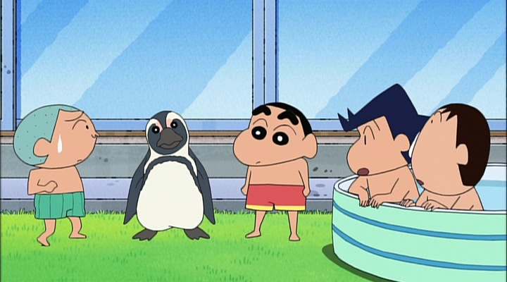マサオくんの家の庭でプール遊びをしようとやってきたしんのすけたち。マサオくんは一番乗りにプールに入ろうとするが、先に入っていたのはなんと、ペンギン……!?