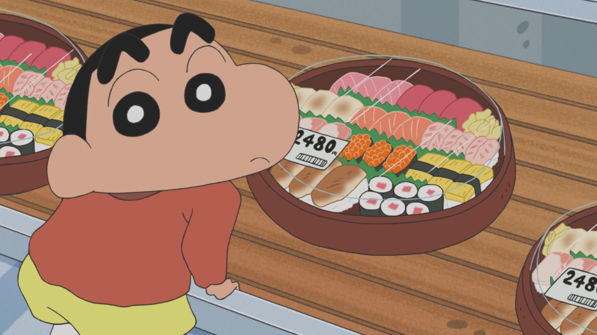夕方6時に半額になるお寿司を買うため、スーパーにやってきたまつざか先生。6時まではあと10分、残るお寿司はあと3パック。これは買える!と思ったその時、しんのすけとひろしがやってきて……!?